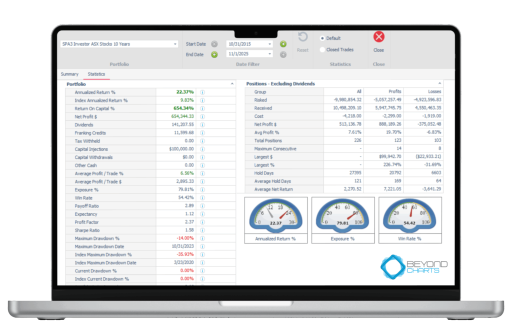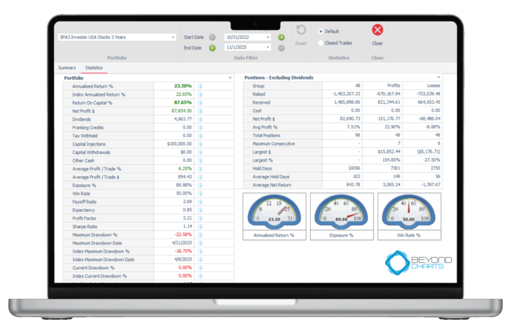 This 3-year stretch favored buy-and-hold a touch. SPA3 still delivered a double-digit CAGR (+11.9%), with controlled drawdown (−14.3%), positive expectancy, and a healthy dividend + franking boost (~$13.9k, ~34% of total profit).
