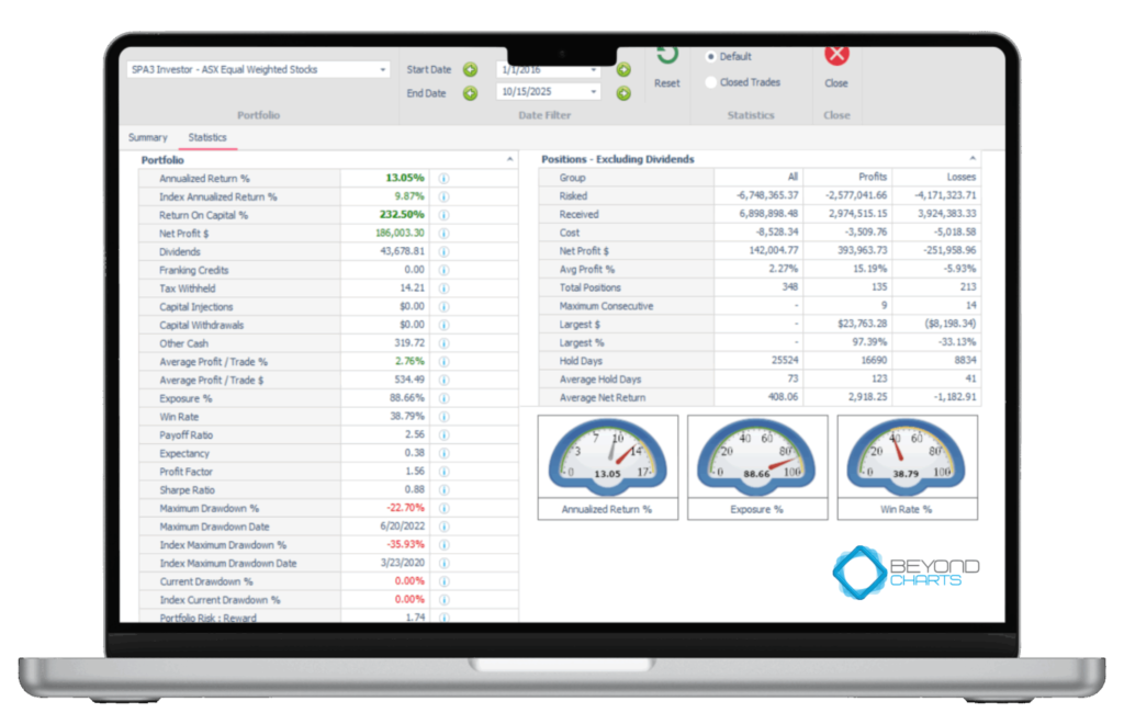 From 2016–2025, SPA3 Investor compounded at 13.05% p.a. vs the market’s 9.87%, turning capital into ~3.3× with a shallower drawdown (-22.7% vs -35.9%) a positive-expectancy, rules-based edge built on bigger winners, smaller losers, and disciplined execution.